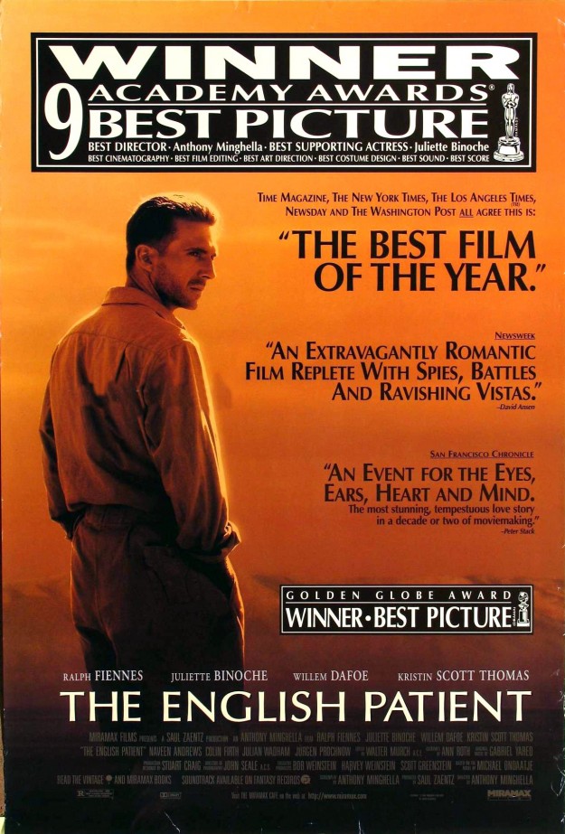 THE ENGLISH PATIENT : Un film de Anthony MINGHELLA (9 Oscars) Synopsis : 1944, en pleine seconde guerre mondiale, un avion vole au-dessus du désert du Sahara, piloté par un homme et transportant une femme évanouie. Des artilleurs allemands abattent l’avion, qui s’écrase, laissant rescapé mais complètement brûlé l’étrange pilote. Des bédouins le recueillent, commencent à…